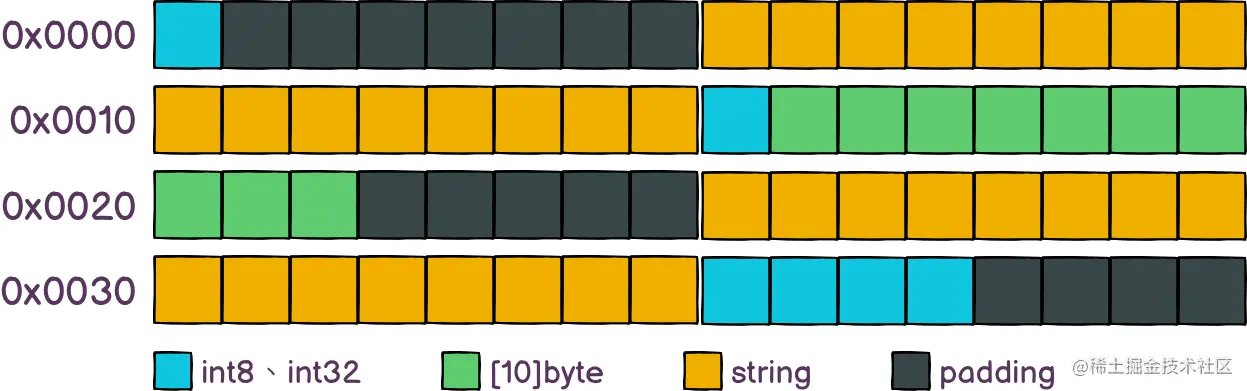 我们看下该结构体在内存中的分布如下,可以看到有很多深色的填充空间,总计浪费了16字节,好像还可以优化。