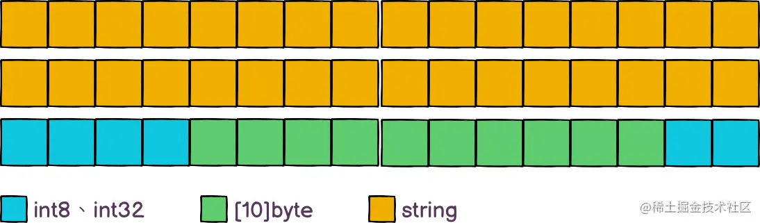 重新排列后,内存的布局会长如下这样,有13个字节的空间是真正存储数据的,而深色的11个字节的空间则是为了对齐而填充上的,不存储任何数据,以确保每个字段的数据都会落到同一个字长里面,所以才会有了开头的13个字节的数据类型实际上变成了24字节。
