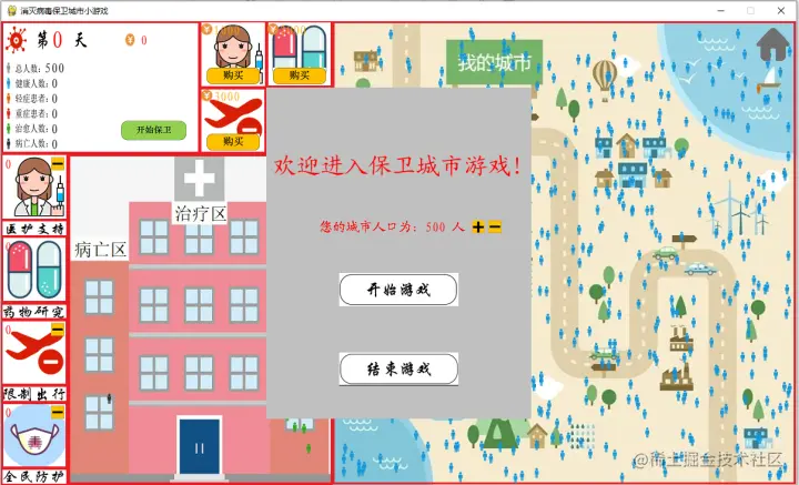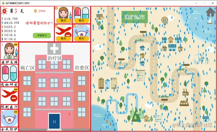 每一天可利用收入进行道具的购买,并开始防护,等所有的感染人员均已治愈或者死亡,游戏胜利or失败。