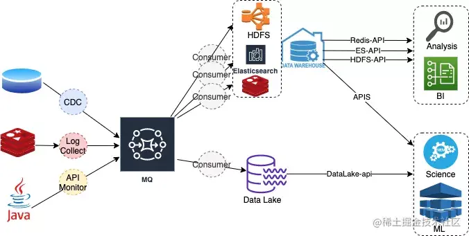 大数据领域的处理处理场景包含数据分析、BI、科学计算、机器学习、指标监控等场景,针对不同场景,业务方会根据业务特点选择不同的计算引擎和存储引擎;例如交易指标可以采用binlog + CDC+ RocketMQ + Flink + Hbase + ELK组合,用于BI和Metric可视化。