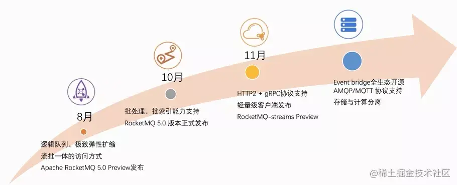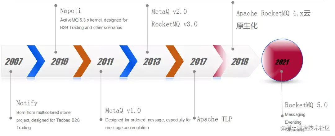 RocketMQ从2017年开始进入Apache孵化,2018年RocketMQ 4.0发布完成云原生化,2021年RocketMQ 5.0发布全面融合消息、事件、流。