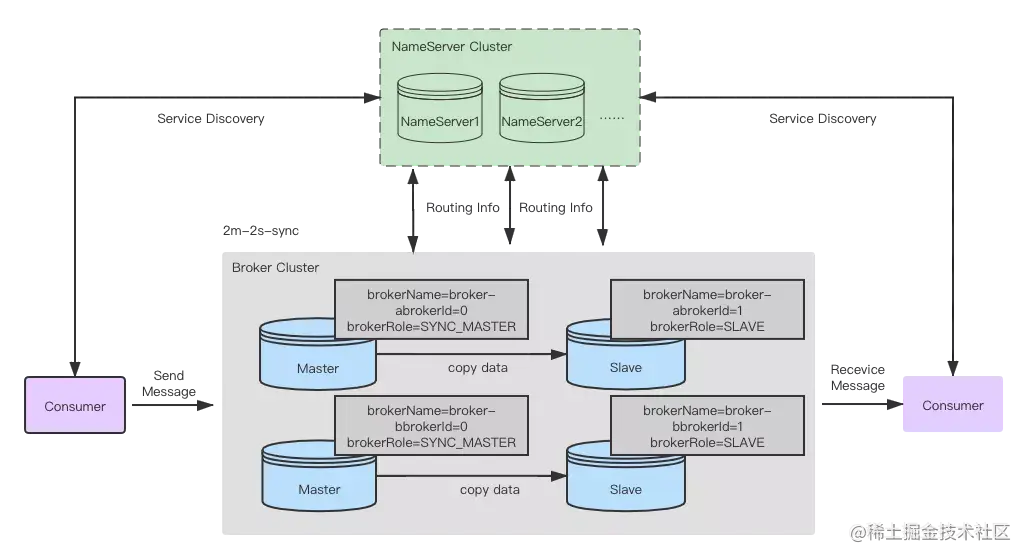 如下图所示, RocketMQ的架构主要包含两部分包括:源数据集群NameServer Cluster和计算存储集群Broker Cluster。