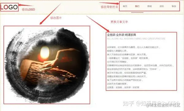 第三步、编辑网站。 在已经安装好的样板网站上,修改网站的logo,导航栏目名称,banner图片,还有产品图片、文章等等。\