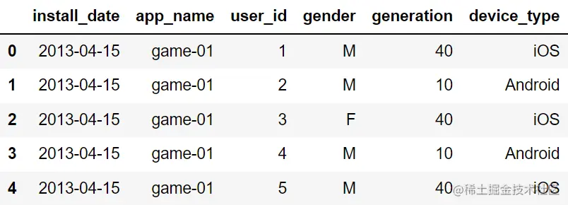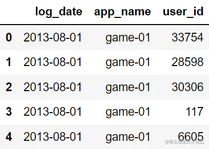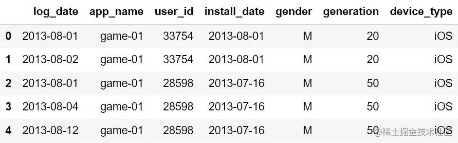 显示 user_data 数据集前五行。