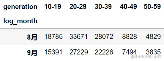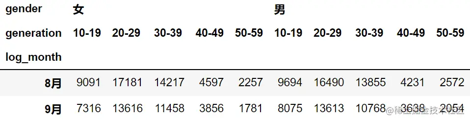 进一步细分,看看是否某个性别下某个年龄段的用户数量减少了,下面我们将性别和年龄段组合起来,形成 2 重交叉列表统计。