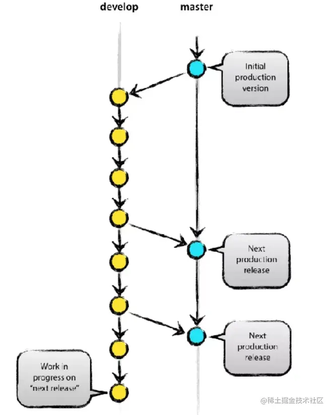 Production分支。也就是我们经常使用的Master分支,这个分支最近发布到生产环境的代码,最近发布的Release, 这个分支只能从其他分支合并,不能在这个分支直接修改。