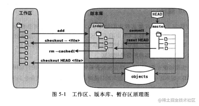 在版本库中标记为index的区域为暂存区,标记为master的是Git为我们自动创建的第一个分支,代表的是目录树。此时HEAD实际是指向master分支的一个“游标”,所以图示的命令中出现HEAD的地方可以用master来替换。图中的objects标识的区域为git的对象库,实际位于.git/objects目录下。