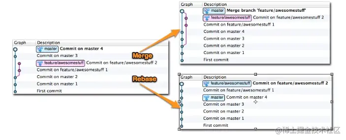 merge操作会生成一个新的节点,之前的提交分开显示。而rebase操作不会生成新的节点,是将两个分支融合成一个线性的提交。