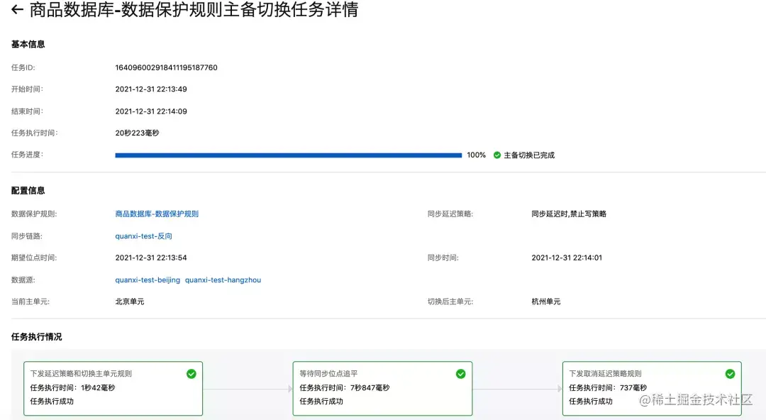 4. 主备切换详情页,可以看到切换进度和切换结果,任务进度 100% 后,表示切换完成。