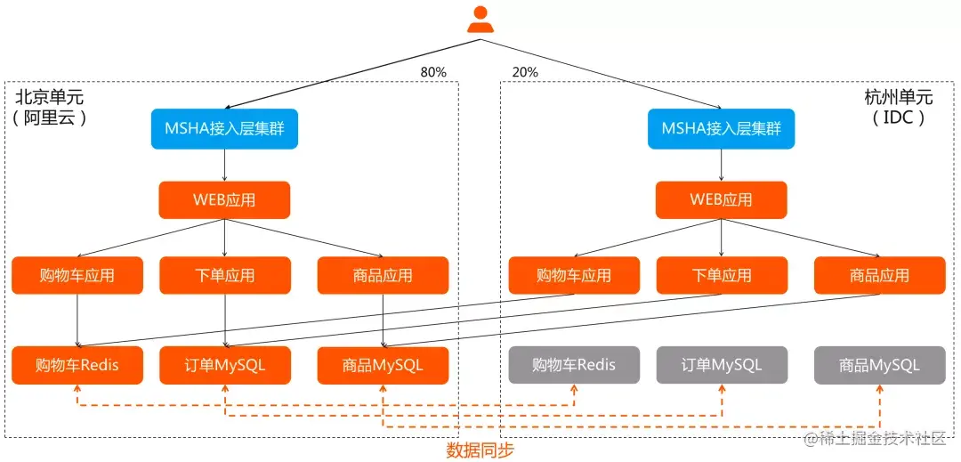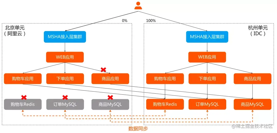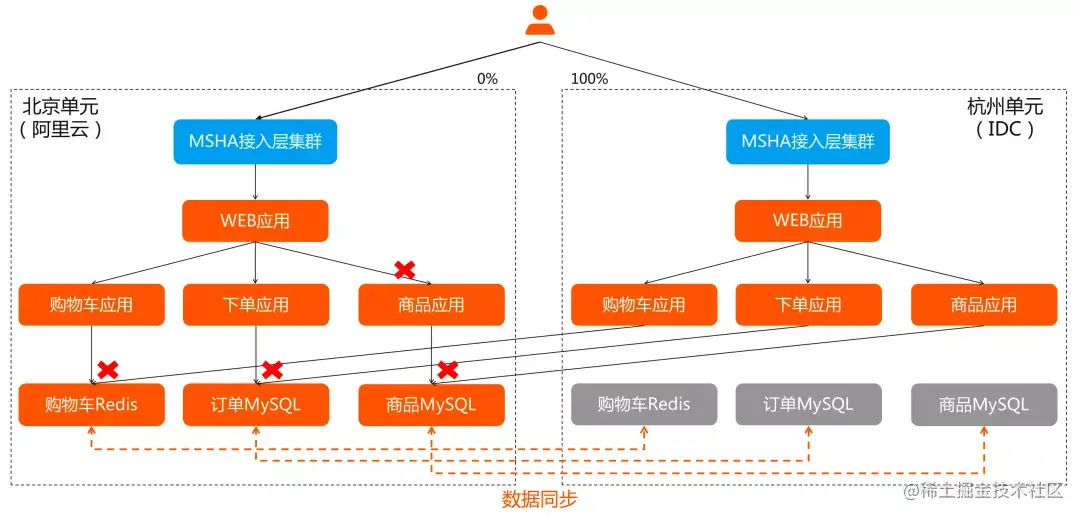 在北京单元的数据库故障的情况下,可以通过 MSHA 数据库切换功能,将应用访问的 Redis/MySQL 的连接切换至杭州单元的数据库(切换过程中会等待数据同步追平,期间会短暂禁写)。