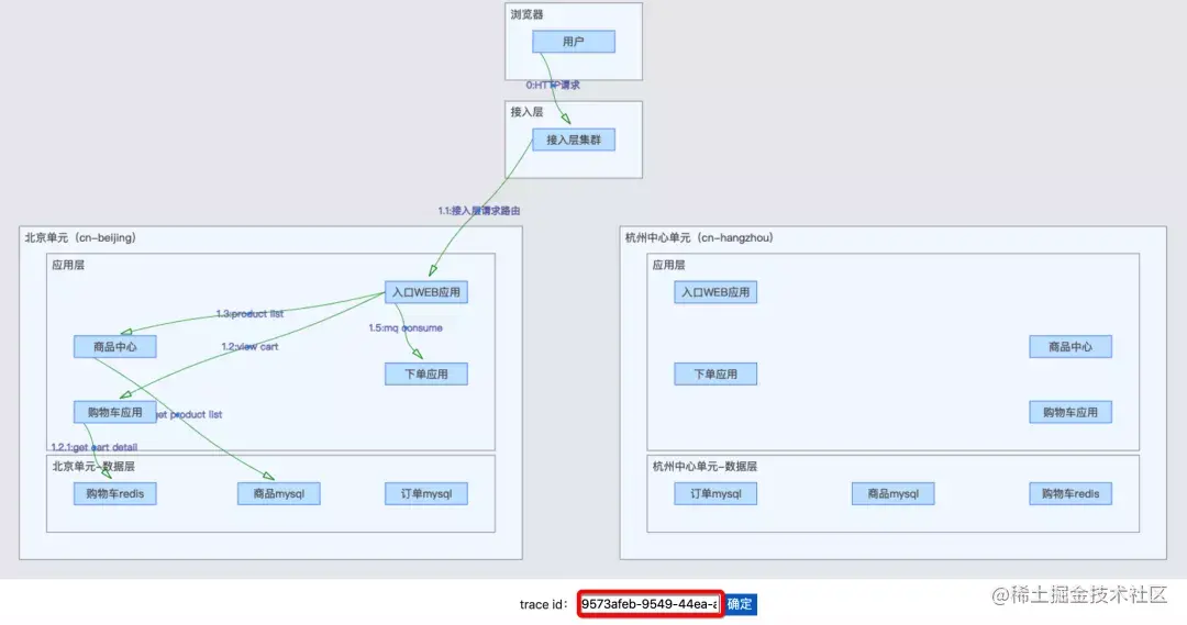 查看实际流量调用链:流量始终访问到杭州单元,读写北京单元内的数据库。