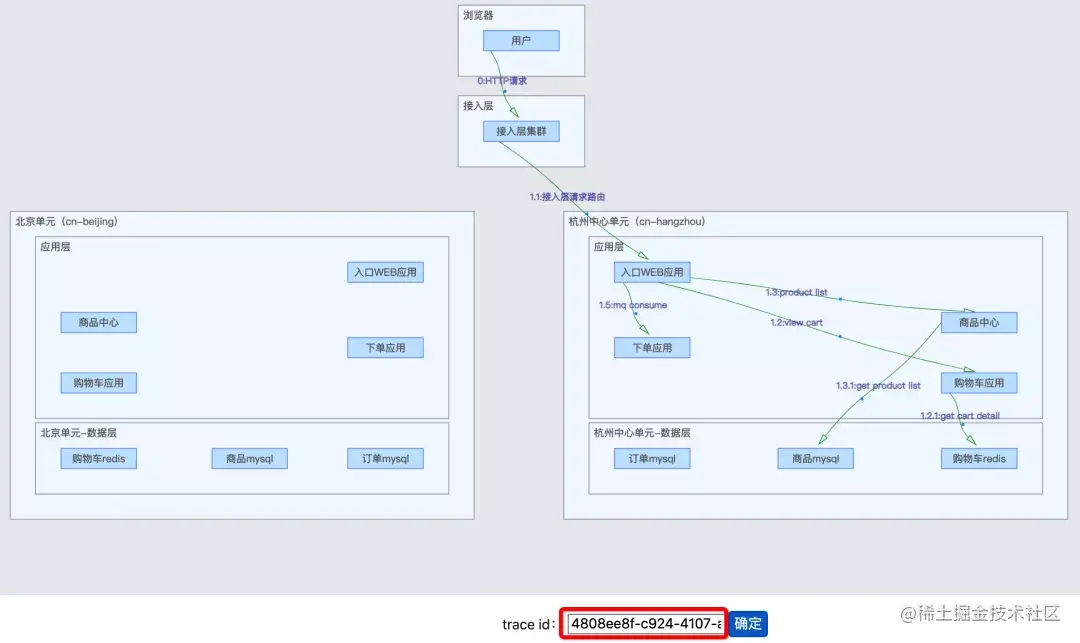 访问电商 Demo 首页,查看实际流量调用链:概率性的访问到北京或杭州单元,均读写北京单元内的数据库。