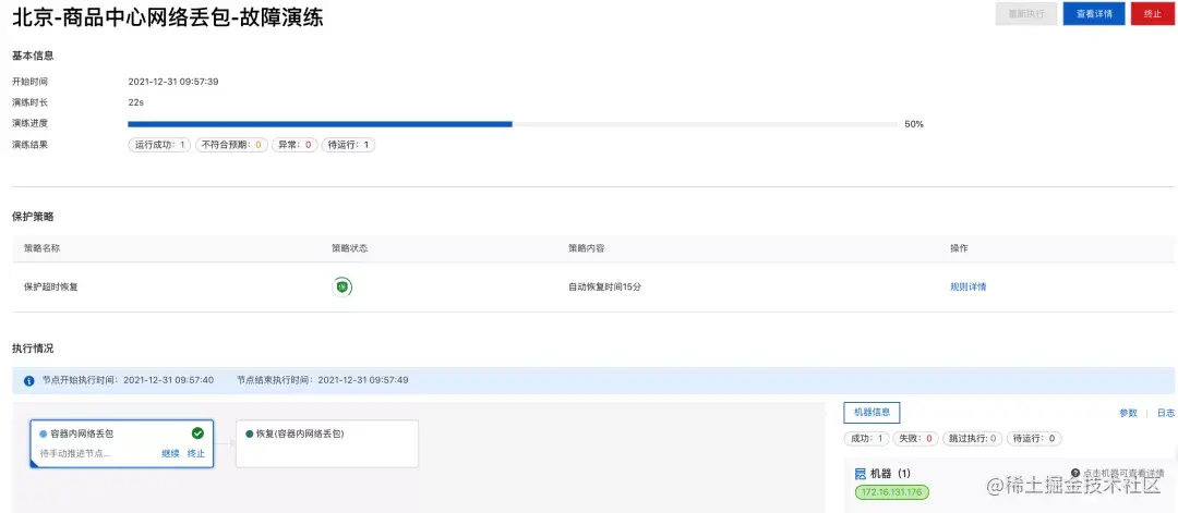 在我的空间选择配置好的演练(50% 概率网络丢包),然后单击执行演练。