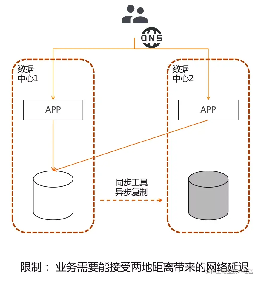 - 数据库异地主备,异步复制备份。应用读写同一数据中心的数据库,避免考虑一致性问题。