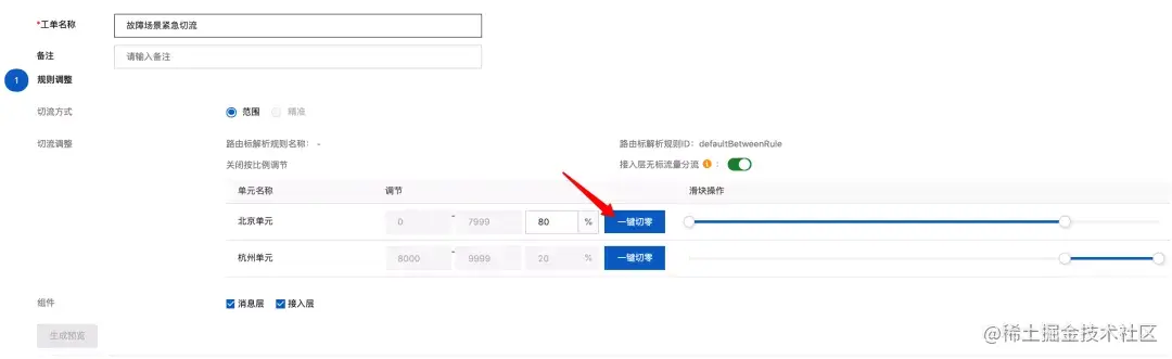 在北京单元的商品应用故障的情况下,可以通过 MSHA 切流功能,将云上入口流量切 0,快速恢复业务。