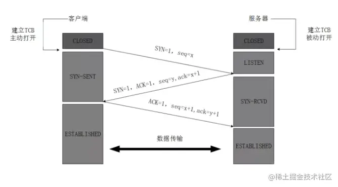 1.TCP服务器进程先创建传输控制块TCB,时刻准备接受客户进程的连接请求,此时服务器就进入了LISTEN(监听)状态;2.TCP客户进程也是先创建传输控制块TCB,然后向服务器发出连接请求报文,这是报文首部中的同部位SYN=1,同时选择一个初始序列号 seq=x ,此时,TCP客户端进程进入了 SYN-SENT(同步已发送状态)状态。TCP规定,SYN报文段(SYN=1的报文段)不能携带数据,但需要消耗掉一个序号。3.TCP服务器收到请求报文后,如果同意连接,则发出确认报文。确认报文中应该 ACK=1,SYN=1,确认号是ack=x+1,同时也要为自己初始化一个序列号 seq=y,此时,TCP服务器进程进入了SYN-RCVD(同步收到)状态。这个报文也不能携带数据,但是同样要消耗一个序号。4.TCP客户进程收到确认后,还要向服务器给出确认。确认报文的ACK=1,ack=y+1,自己的序列号seq=x+1,此时,TCP连接建立,客户端进入ESTABLISHED(已建立连接)状态。TCP规定,ACK报文段可以携带数据,但是如果不携带数据则不消耗序号。5.当服务器收到客户端的确认后也进入ESTABLISHED状态,此后双方就可以开始通信了。