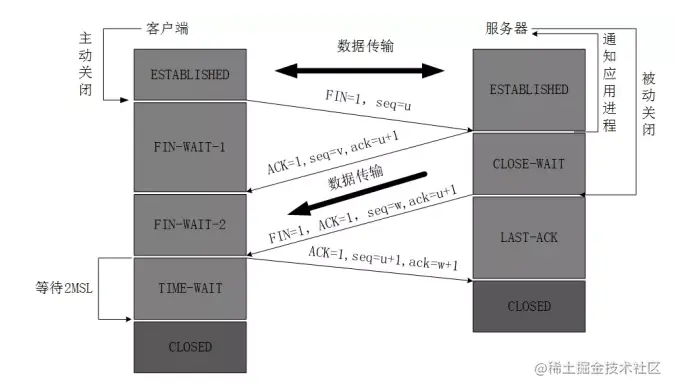 客户端收到服务器的连接释放报文后,必须发出确认,ACK=1,ack=w+1,而自己的序列号是seq=u+1,此时,客户端就进入了TIME-WAIT(时间等待)状态。注意此时TCP连接还没有释放,必须经过2MSL(最长报文段寿命)的时间后,当客户端撤销相应的TCB后,才进入CLOSED状态。