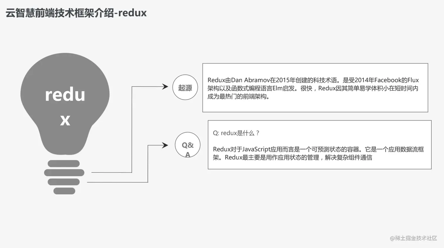 redux是由Dan Abramov在2015年创建的科技术语,受2014年Facebok的Flux架构以及函数式编程语言Elm启发。很快,Redux因其简单易学体积小在短时间内成为热门的前端架构。