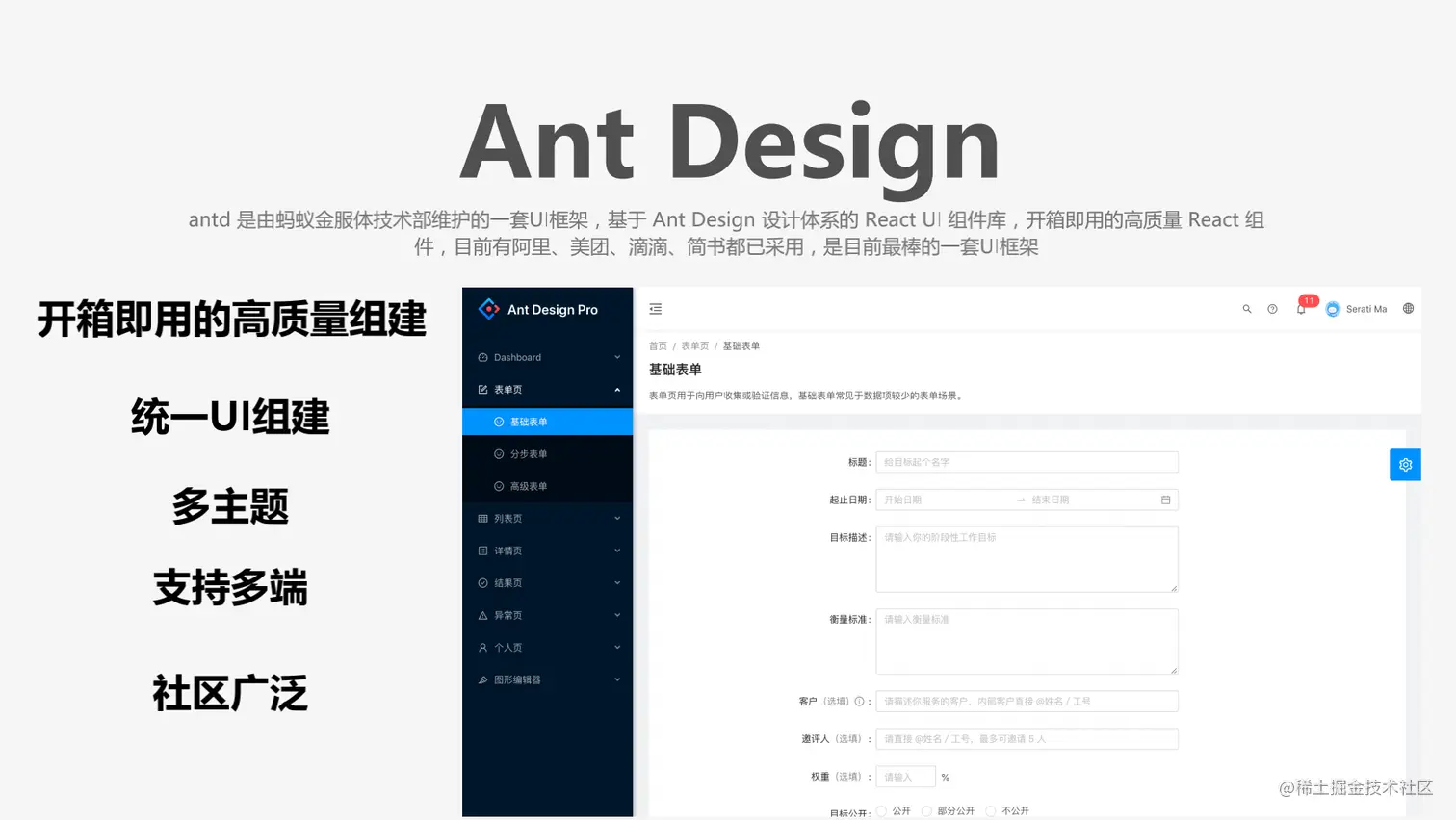 antd是由蚂蚁金服体技术部维护的一套UI框架,基于Ant Design设计体系的React UI组件库,开箱即用的高质量React组件,目前与阿里、美团、滴滴、简书都已采用,是目前较优秀的一套UI框架。