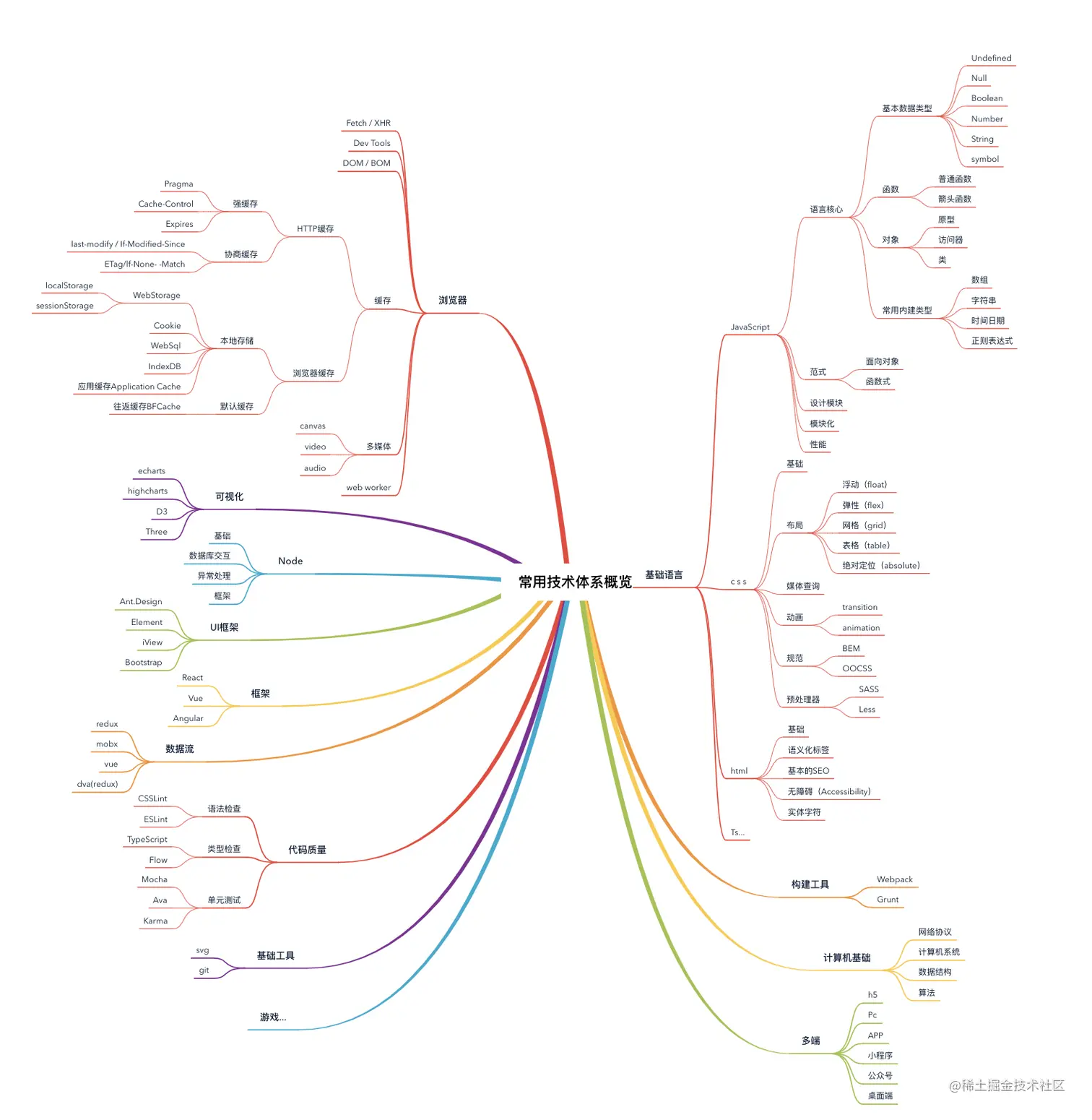 浏览器、可视化、Node、UI框架、数据流、代码质量、基础语言、基础工具等等,如下图: