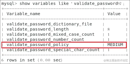 (注:使用相同的MySQL安装包,在CentOS7.2下执行此命令,要求必须先完成首次的root密码修改,而中标麒麟7下则不需要,可以在临时密码的状态下查看当前密码策略)