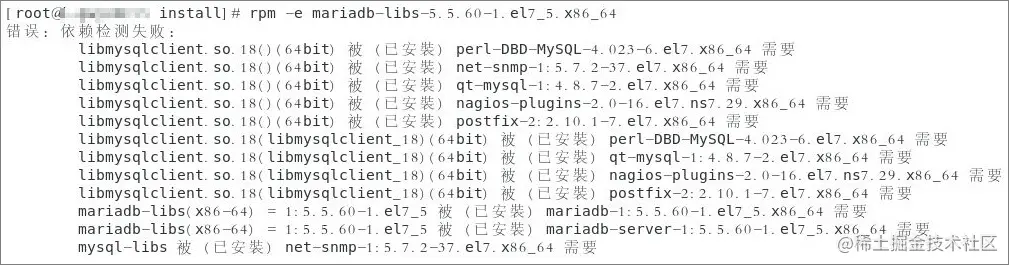 --nodeps指定在安装或卸载时,不检查依赖关系。如果没有使用--nodeps,卸载会出现如下错误: