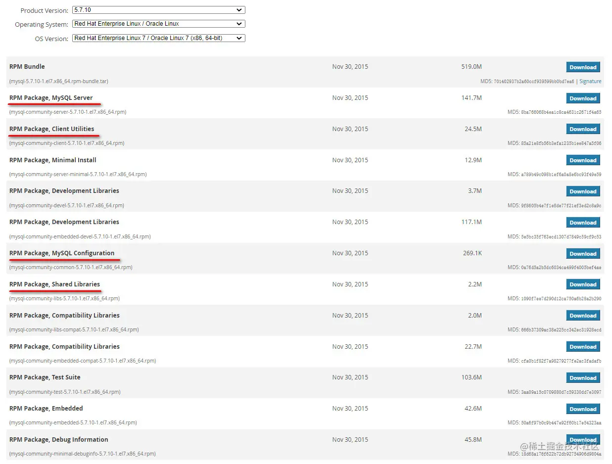 选择MySQL与操作系统的版本,下载对应的软件安装包(本文选取的是5.7.10-1.el7.x86_64版本)。