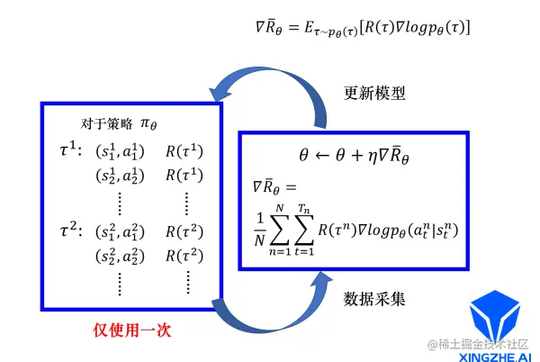 更新完模型以后,我们要重新去收集数据再更新模型。注意,一般策略梯度采样的数据就只会用一次。把这些数据采样起来,然后拿去更新参数,这些数据就丢掉了。接着再重新采样数据,才能够去更新参数。不过这也是有解决方法的,接下来我们会介绍如何解决。