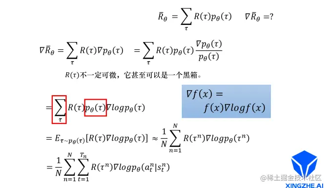 如何最大化期望奖励呢,既然是最大化,那么我们可以采用梯度上升的方式更新参数,使得期望奖励最大化。对取梯度,这里面只有是跟有关。整个策略梯度公式如下图所示。