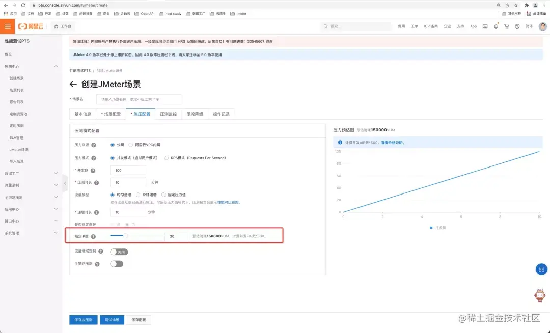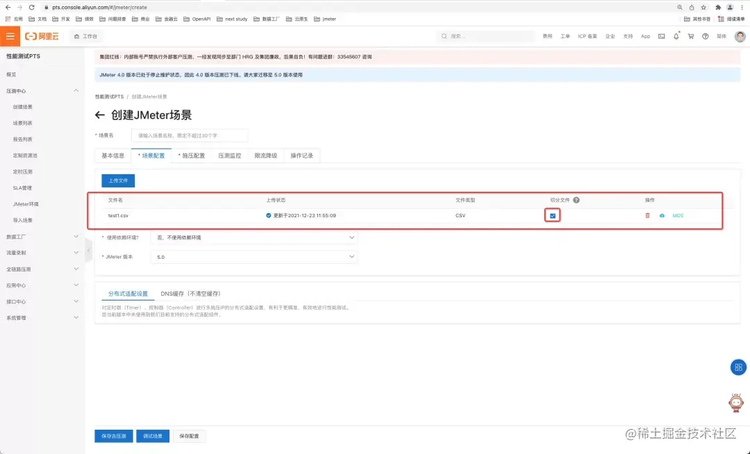 1、创建场景:PTS 的 JMeter 压测以场景为核心,压测对象为一个场景,场景中包括JMeter(原生)脚本、JMeter 依赖(一系列依赖 jar 包和一系列 properties 配置)、及一些压测配置(PTS 压测的配置,例如公网/VPC 压测、并发量、引擎数量、压测时长等)。