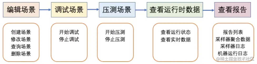2、压测场景:对场景的操作分为两方面,一是对场景配置的增删改查,二是对场景的压测和调试。