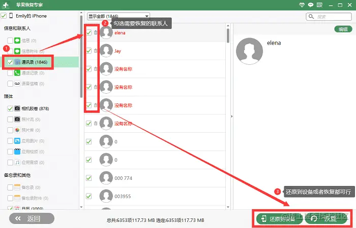 步骤二: 扫描完成后,点击“通讯录”,就会显示我们已删除的和未删除的所有联系人(红色代表已删除,黑色代表未删除),选择完要恢复的联系人后,点击“恢复”即可。