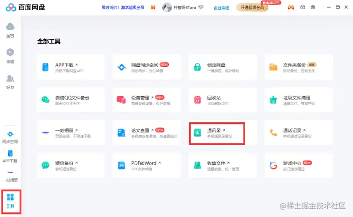 步骤一: 下载电脑版的百度网盘,或者直接在网页上登录也行,下载并安装完成后,登录自己的账号,点击左下角的“工具”,再选择“通讯录”;
