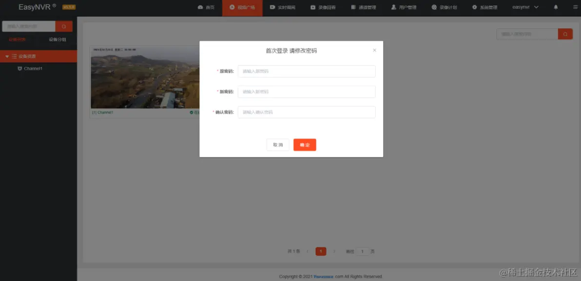 为了提升平台的安全性,创建的账号在首次登录后要求必须修改密码才能正常使用,如果不修改密码将会自动退出 EasyNVR 平台,如图: