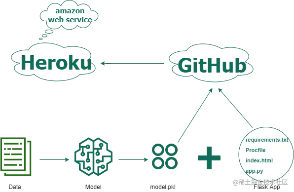 Heroku是Salesforce的一个平台即服务工具。Heroku由AWS支持,所有Heroku应用/服务都托管在AWS上。AWS提供基础设施并处理所有的负载平衡、资源利用、网络、日志、监控,而Heroku作为一个中间人,提供一个可扩展的、自动化的快速部署平台,具有所有的云功能。使用Flask将提供测试的UI,它可以与企业级的应用程序集成。