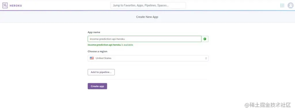 在第6步,我们将登录Heroku并创建一个新的应用程序,这里是收入预测-api-heroku。