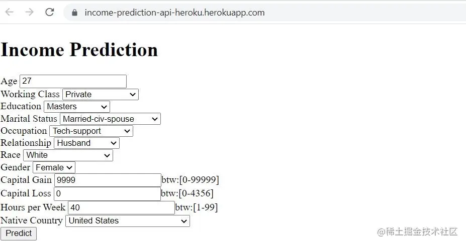 一旦你填写了所有的字段并点击预测,它就会给出最终的预测结果。