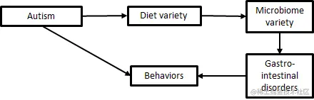 最后,我们有一些情况似乎是大自然设计的,以绊倒和迷惑科学家。例如,人们知道自闭症与较简单的肠道微生物组(即,肠道中较少的多样化细菌群)有关已经有一段时间了。这是否意味着微生物组导致自闭症?最近的一项研究表明,"不,是反过来的":自闭症儿童经常有限制性饮食,因为感官体验会使他们不知所措,而有限的食物种类导致有限的微生物组种类。但接下来,如何解释粪便移植能改善自闭症儿童的行为?一个新出现的假设是:"粪便移植通过缓解不平衡的微生物组直接带来的不适症状,改善了自闭症儿童的行为,但却没有影响病情的神经基础"[3]。那么,相应的因果图将是。