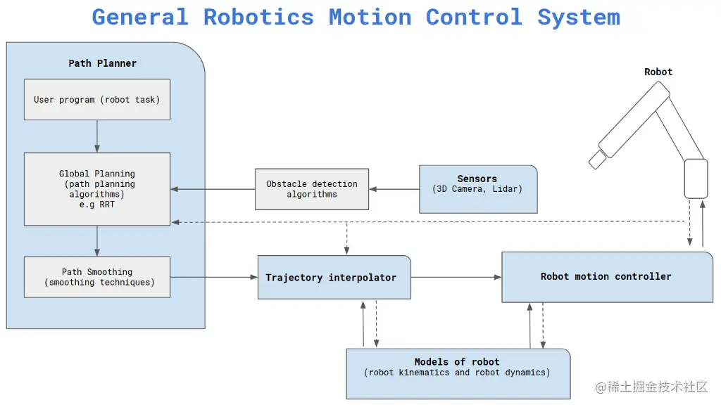 请注意,上述描述只是对真正的机器人运动控制系统的简化,它通常是针对机器人和应用的。