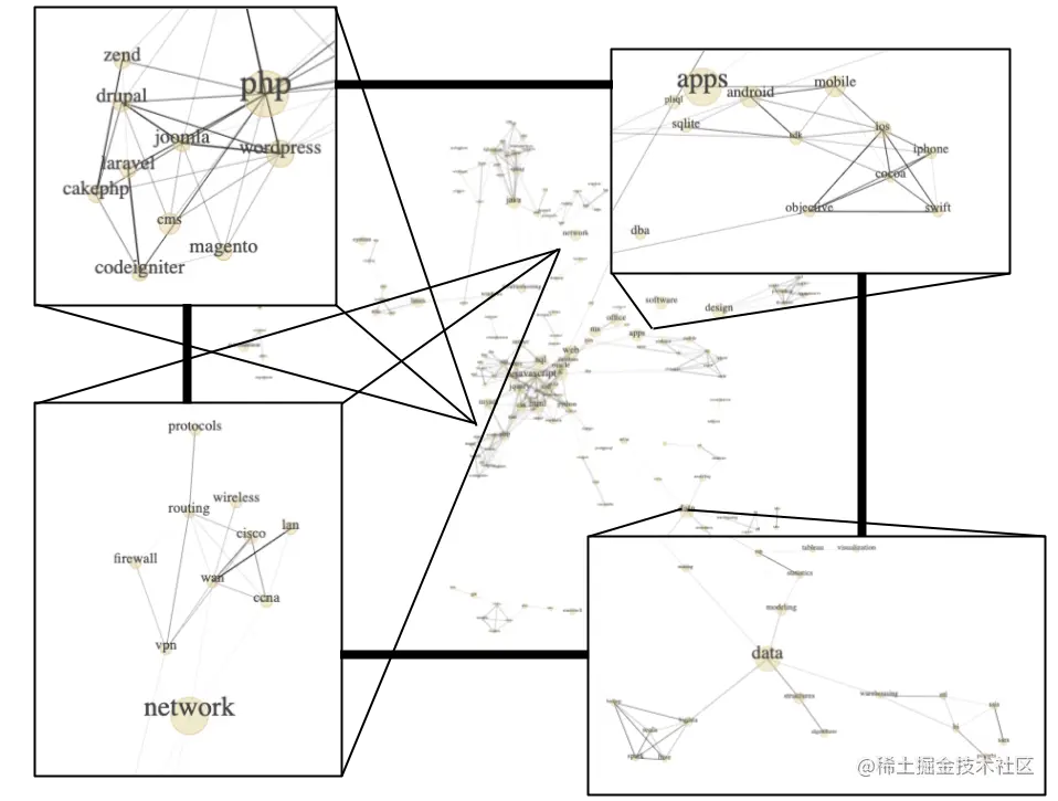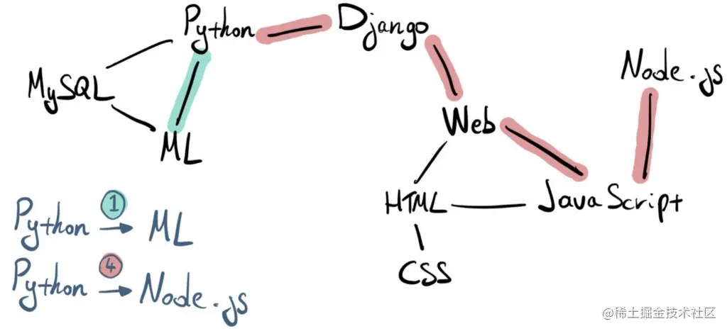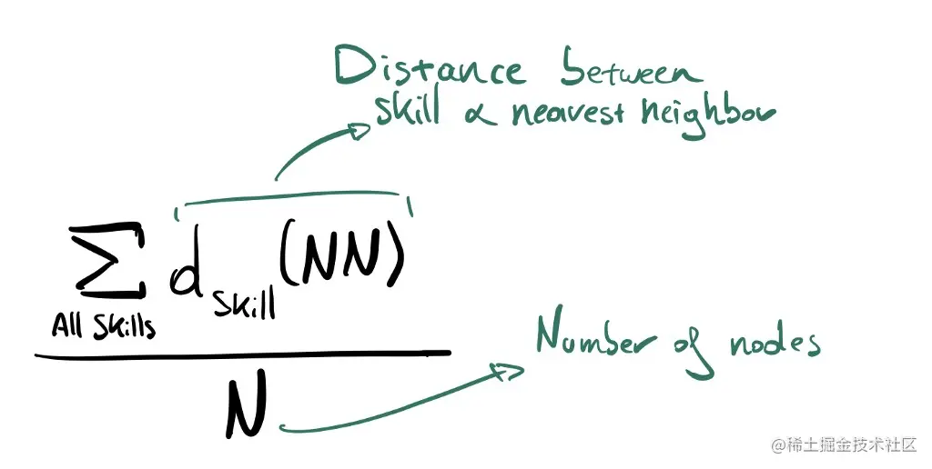 技能分离;网络图由通过边连接的节点组成。如果技能密切相关,那么距离(形成连接的边的数量)就会很短。然而,如果技能之间没有任何关系,比如说MongoDB和Photoshop,那么需要覆盖的距离就会长很多。