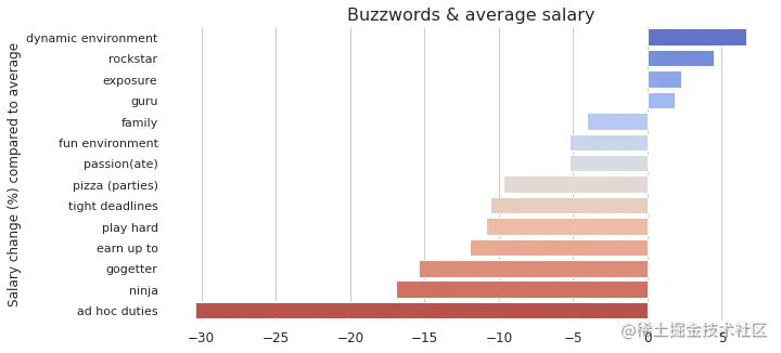 在这些关键词中,有很多似乎与工资有明显的关系,特别是_忍者_、Gogetter 和临时性的_职责_。但正如你所知,相关关系并不总是因果关系。可能有许多其他的变量在起作用。例如,这些流行语经常被创业公司使用,而众所周知,这些公司的工资较低。