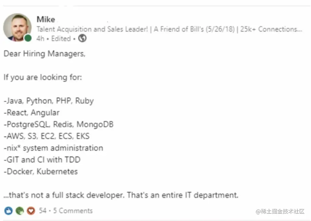 写关于工作描述中不切实际的期望的想法在我心中已经有一段时间了。你经常可以在Twitter或Reddit上看到人们分享荒谬的工作描述截图的帖子。甚至有这么一个人,在他的LinkedIn资料中加入了口袋妖怪,只是为了看看招聘人员是否会注意到。然后在去年,我通过一个共同的朋友认识了一个招聘人员。我问她是否觉得写工作描述很有挑战性,比如说IT,她的知识有限,她回答说:"哈哈,我们不知道,但这并不重要。这很难用语言来表达,但她说这话的时候有一种错位的自豪感,这让我觉得不得不开始查看数据,试图量化这个问题。