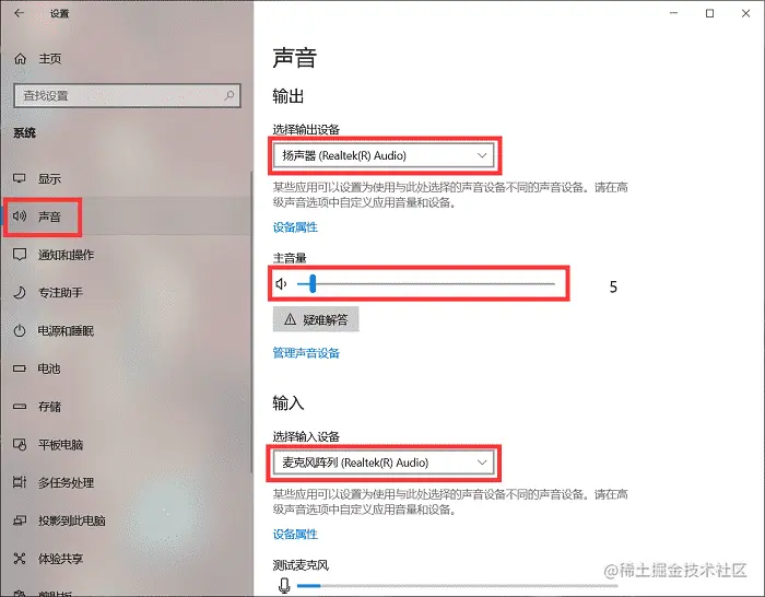 步骤三:选择左方的“声音”,在右侧信息框里选择相关设备,然后调节音量。