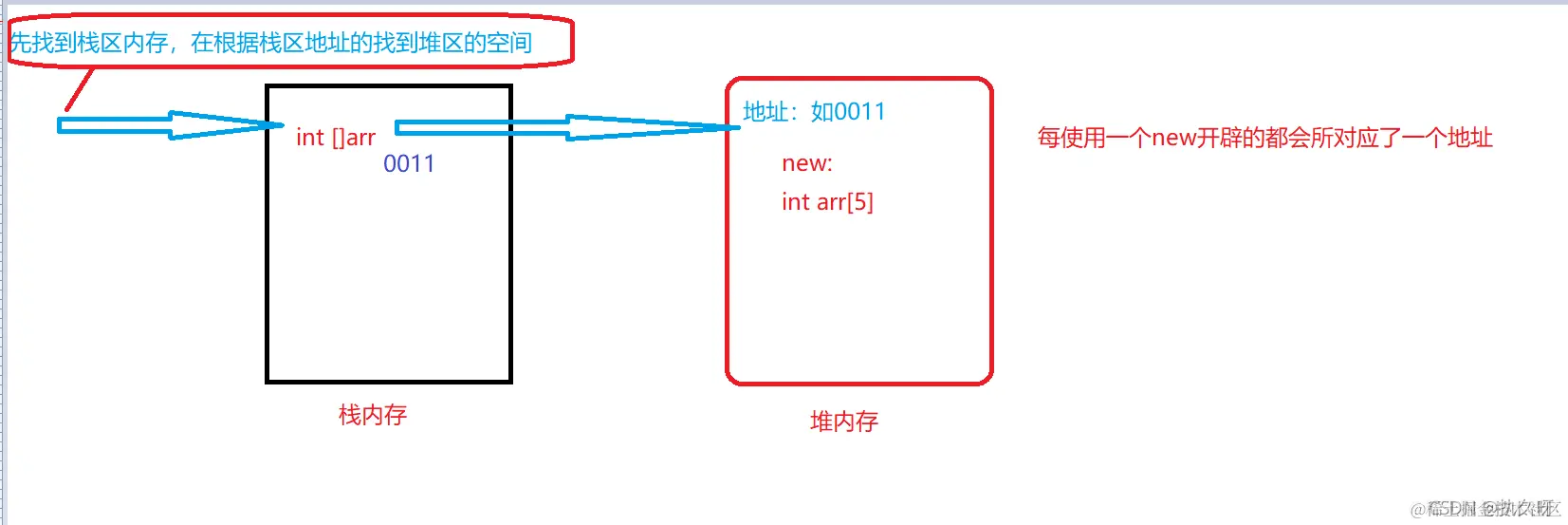 如int[]arr=new int[5];其中new是开辟空间的,new左边的int[]arr时在栈区开辟,右边是
