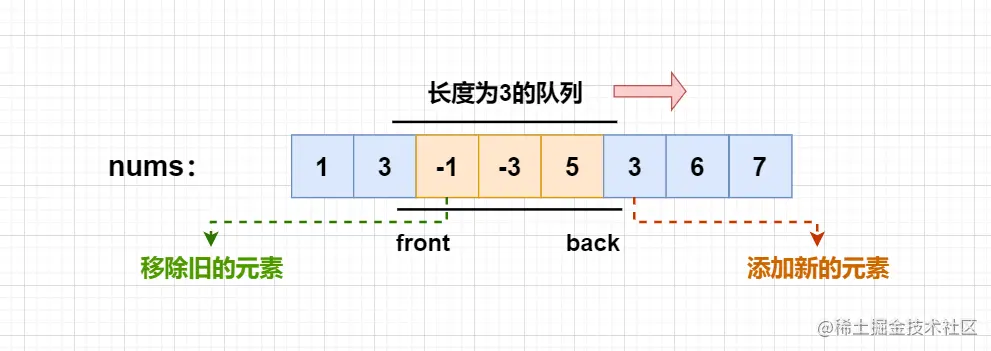 为了方便判断队首元素与滑动窗口的位置关系,队列中保存的是对应元素的下标。