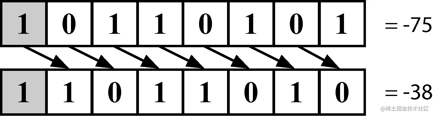 通过算术移位,我们最终会得到-1,因为我们不断地将数位1移入最高位。一串1构成的(有符号)整数表示-1。