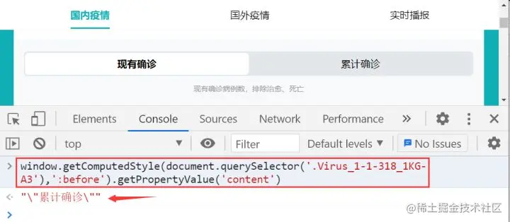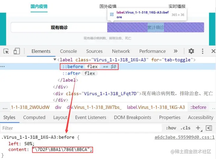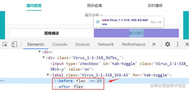 由于伪元素是通过 CSS 样式展现的行为,所以我们可以通过 CSS 样式选择器来进行定位,以“百度疫情大数据为例”: