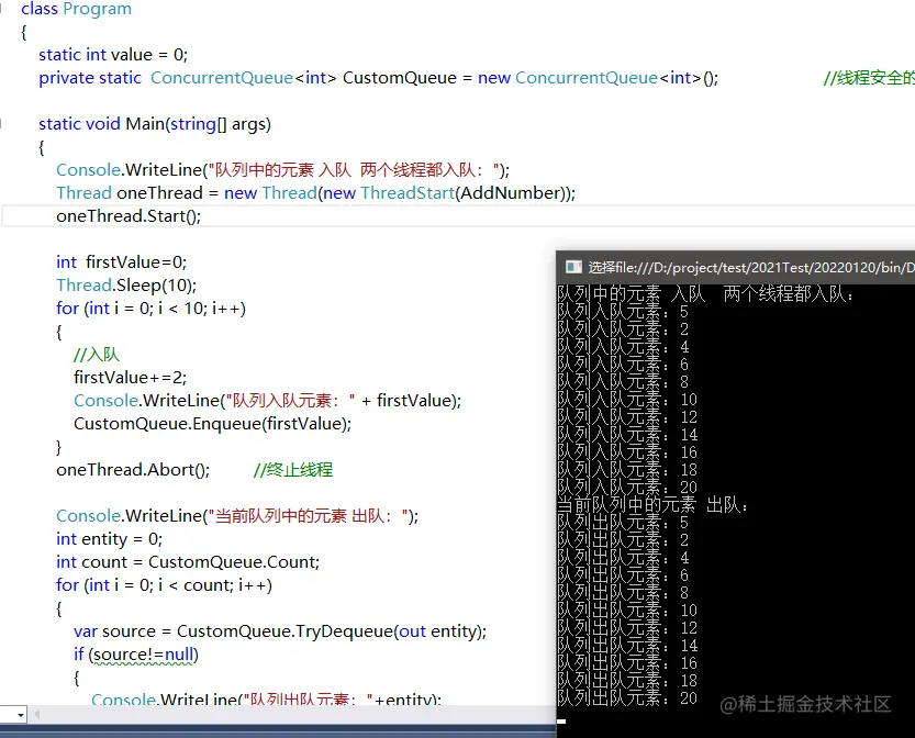 Console.WriteLine("队列中的元素 入队 两个线程都入队:");