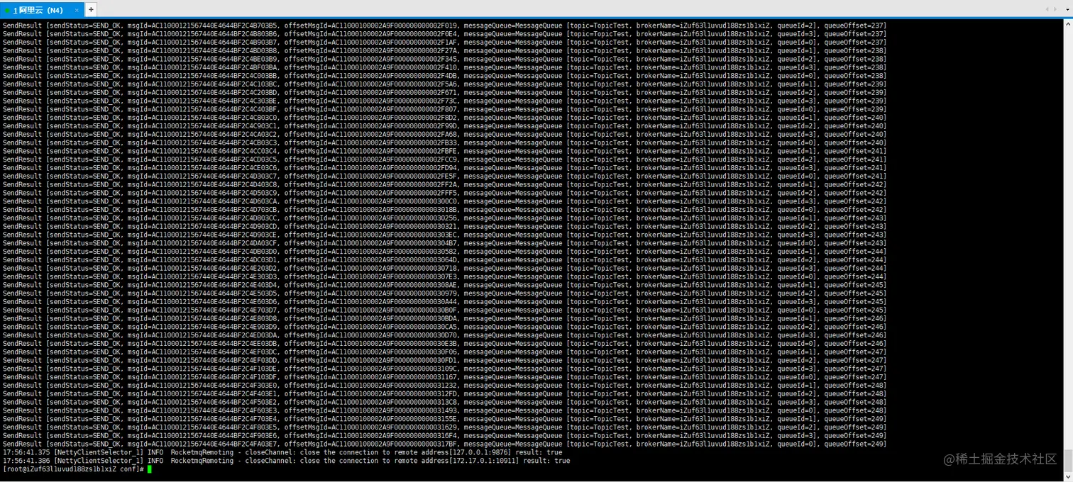 这日志中,上面部分就是我们发送的消息的内容。后面两句标识消息生产者正常关闭。