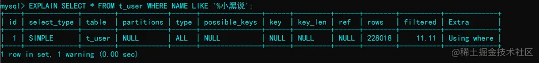 EXPLAIN SELECT * FROM t_user WHERE NAME LIKE '%小黑说';索引失效;